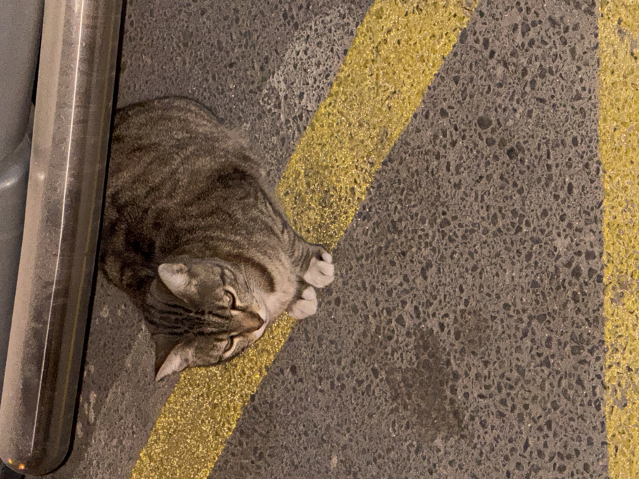 - "A domestic short-haired tabby cat, exhibiting brown and grey striped fur with white paws, is captured sitting on a rough asphalt surface" by FM-tFDjG2, licensed under CC BY 4.0