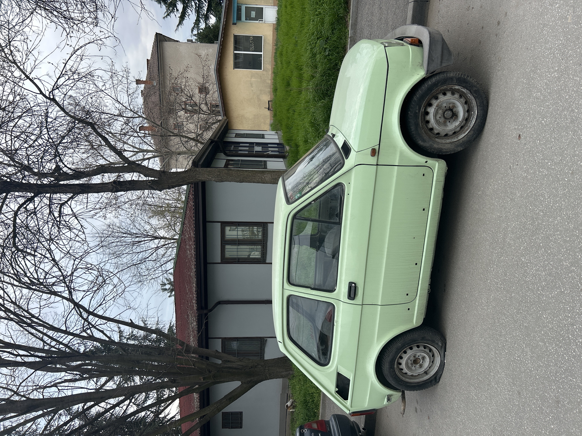 A light green Fiat 126p is parked on the side of a street in Plovdiv, Bulgaria. The car is dusty and appears to be in a state of disrepair. It is parked in front of two residential buildings, one with a light-colored facade and a red tile roof, and another with a light yellow facade. A bare tree with many branches is visible between the car and the buildings. The sky is overcast. The location is likely a residential area within the city.