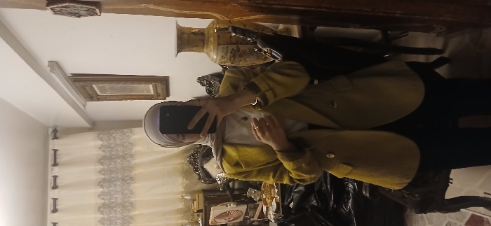 A forensic examination of the image reveals an indoor scene, likely a residential interior, within Al-Midan Municipality, Syria. **Subject:** A female individual, partially visible, is taking a mirror selfie. She wears a light-colored hijab, a white top, a mustard-yellow blazer with two gold buttons on each side, and dark trousers. Her right hand, adorned with a ring, holds a black smartphone, obscuring her face. Her left hand is near the blazer's lapel. **Environment:** The setting appears to be a living area or a room furnished with ornate, dark wooden furniture, including what resembles a chair or sofa with intricate carvings and a dark, possibly velvet, upholstery. * **Walls:** The walls are light-colored, possibly white or off-white. On the right wall, a rectangular framed picture with a gold-colored frame is visible, and above it, a decorative, carved wooden object is mounted. * **Curtains:** To the left, light-colored curtains with an embroidered pattern across the middle are drawn, covering a window. The curtain rod is dark, with circular eyelets. * **Objects:** A tall, ornate vase with a yellow and brown patterned design stands on a table or cabinet to the right of the subject. A white, circular electric fan is visible on a surface to the far left. Below the fan, a table holds several dishes or bowls and multiple black plastic bags. The floor is partially visible towards the bottom left, showing light-colored, possibly patterned, tiles. The overall lighting suggests an indoor setting, potentially with artificial light sources.