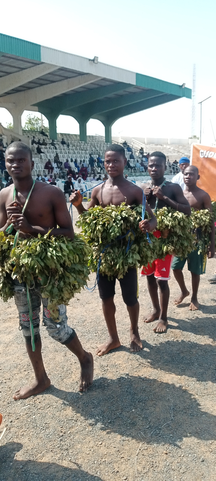 The image depicts an outdoor scene at a stadium in Jimeta, Nigeria, under a clear, bright sky. Four young bare-chested males, appearing to be in their late teens or early twenties, are walking from left to right across a gravel-covered ground. Each male carries a large bundle of fresh green leaves, secured with blue cords, positioned around their lower torso. The first male from the left wears distressed grey denim shorts with red accents, a green cord around his neck, and is barefoot. The second male, walking slightly behind and to his right, wears black knee-length shorts, a blue cord around his neck, and is barefoot. The third male wears red shorts with white stripes and a blue beaded necklace, holding a blue cord in his right hand, also barefoot. The fourth male, partially obscured on the far right, wears green shorts and is barefoot, carrying a similar leaf bundle. In the background, a stadium structure features a prominent green and white striped roof supported by white arched concrete beams. Beneath the roof, multiple rows of white plastic stadium seats are visible, populated by numerous spectators dressed in varied attire. Some individuals are standing. An orange and white sign is partially visible on the far right. The ground is composed of light-colored gravel and dirt, with distinct shadows cast by the bright sunlight.