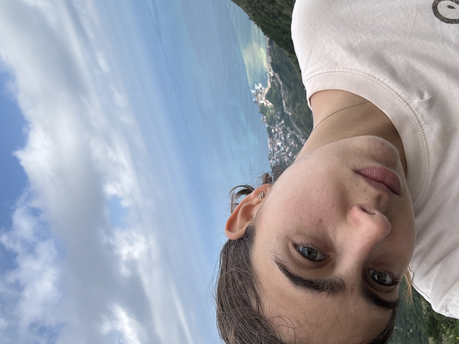 A selfie shows a woman with fair skin, dark eyebrows, and light eyes, appearing to be set against a scenic backdrop. The background reveals a blend of sky, water, and land. Fluffy white clouds dominate the sky above a body of water, which merges with green, hilly terrain dotted with buildings. Her short dark hair is pulled back. She is wearing a light-colored t-shirt.