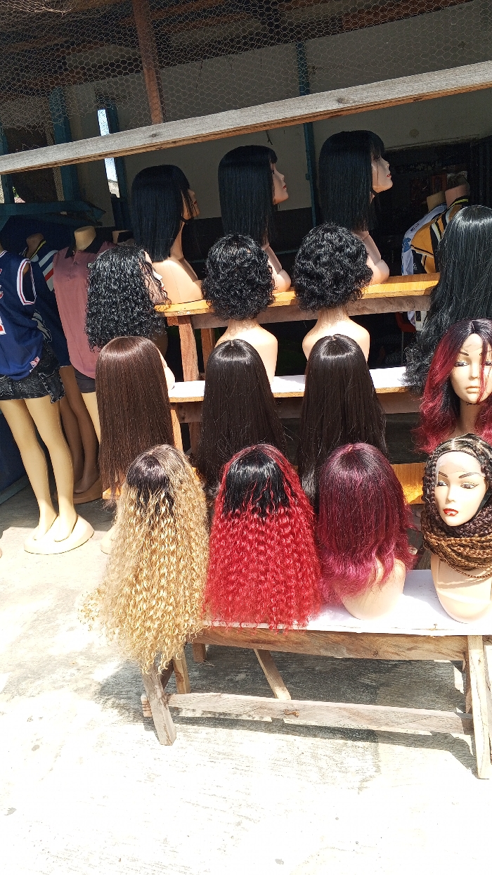 - "A street market stall in Lokoja, Nigeria, displays numerous wigs on mannequin heads, illuminated by bright daylight" by FM-zx5Cv2, licensed under CC BY 4.0