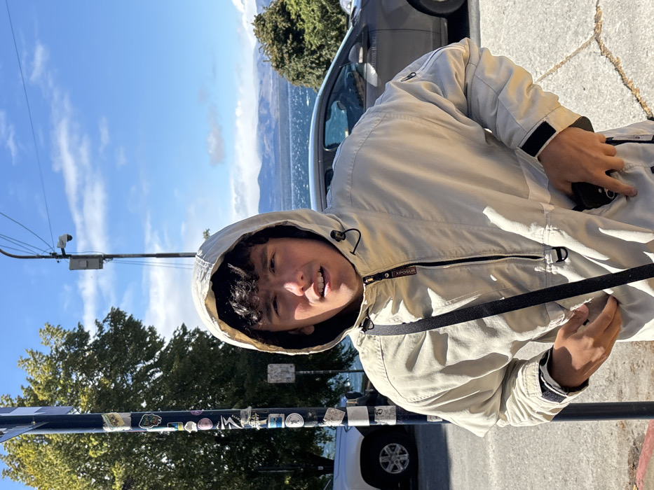 A young man in a hooded khaki jacket stands beside a pole adorned with stickers. He looks at the camera with a slight smile. A body of water, likely a lake, is visible in the background, framed by mountains and a clear blue sky with scattered clouds. Cars are parked nearby. Overhead power lines and a security camera are visible atop a pole.