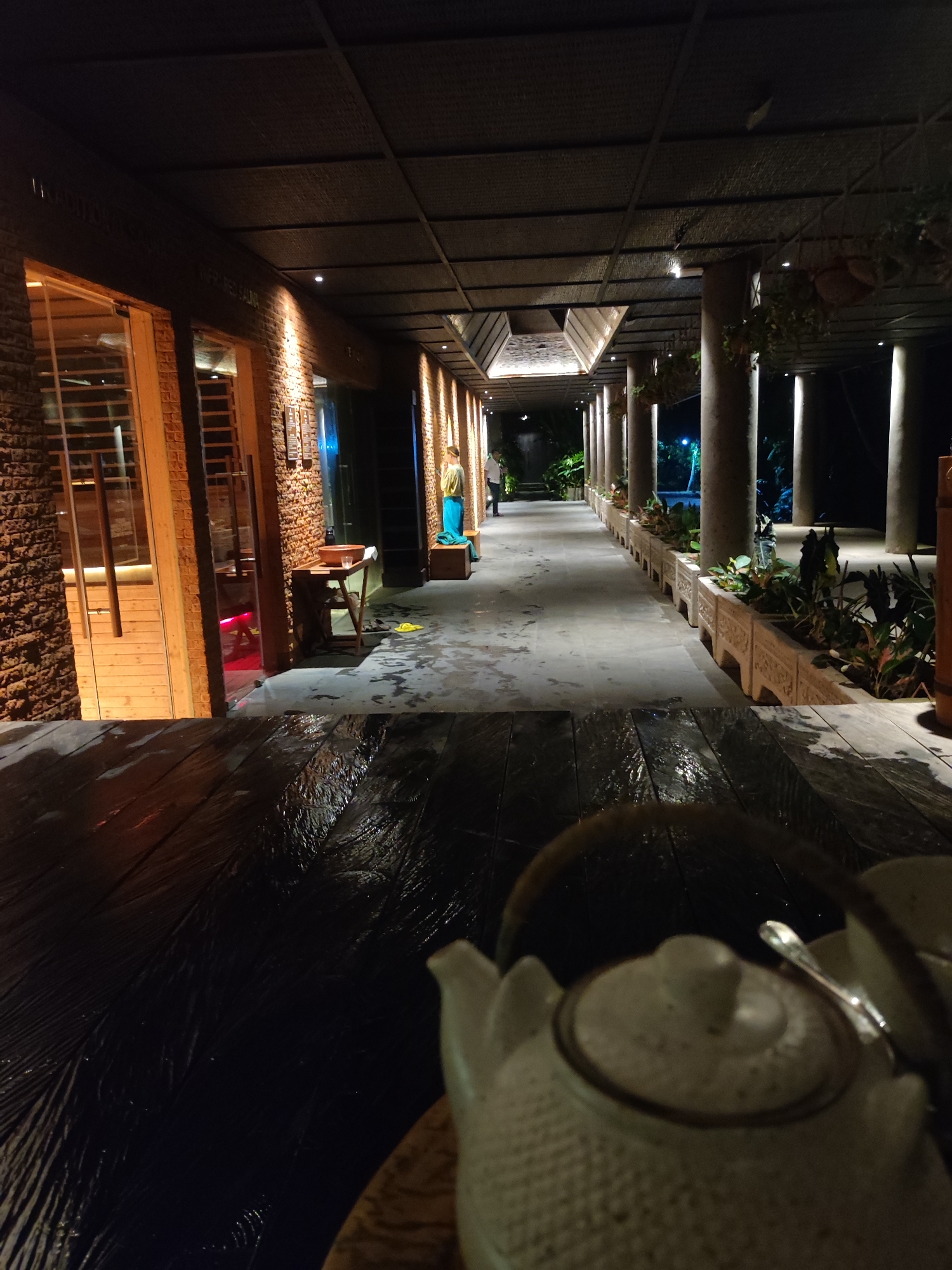 This nighttime image captures a covered outdoor walkway or veranda, consistent with a resort or hotel property, located in Mas, Indonesia. The immediate foreground features a white, textured teapot with a dark handle and a silver spoon on its lid, resting on a dark, wet, reflective surface, suggesting a table. The walkway extends into the midground, comprising a dark, wet, reflective surface transitioning to a lighter, also wet, concrete or stone path. Along the left, a textured dark brick or stone wall features several wooden-framed glass entrances; one entrance reveals an interior space illuminated with a reddish glow. A small wooden table with a brown bowl and white cloth is positioned against this wall, with yellow flip-flops visible on the ground nearby. Further down the path, a human-sized statue, dressed in a light top and a blue/green sarong-like garment, stands against the wall. Signs, one partially decipherable as "FRIED SALAD," are mounted on the wall. To the right, a series of thick, round, grey pillars supports the dark, textured ceiling, from which hanging plants are suspended. A continuous row of ornate, light-colored planter boxes, filled with green and reddish-leafed plants, lines the path between the pillars. The ceiling is equipped with recessed lighting fixtures, and upward-facing lights illuminate the pillars and plants. In the distant background, a person in a white shirt and dark pants is visible walking away, at the far end of the illuminated path. The environment is artificially lit, and multiple surfaces exhibit wetness and reflections.
