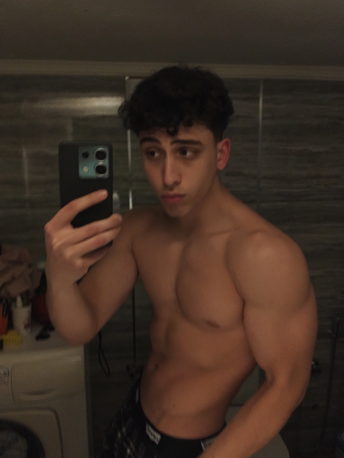 A shirtless young man poses in a bathroom mirror, holding a smartphone in his left hand. He has dark curly hair and wears patterned boxers. The bathroom features tiled walls, a washing machine, and various toiletries. The man's physique is muscular, showing well-defined chest and arm muscles. The lighting is soft, creating shadows that accentuate his contours. He looks directly at the phone.
