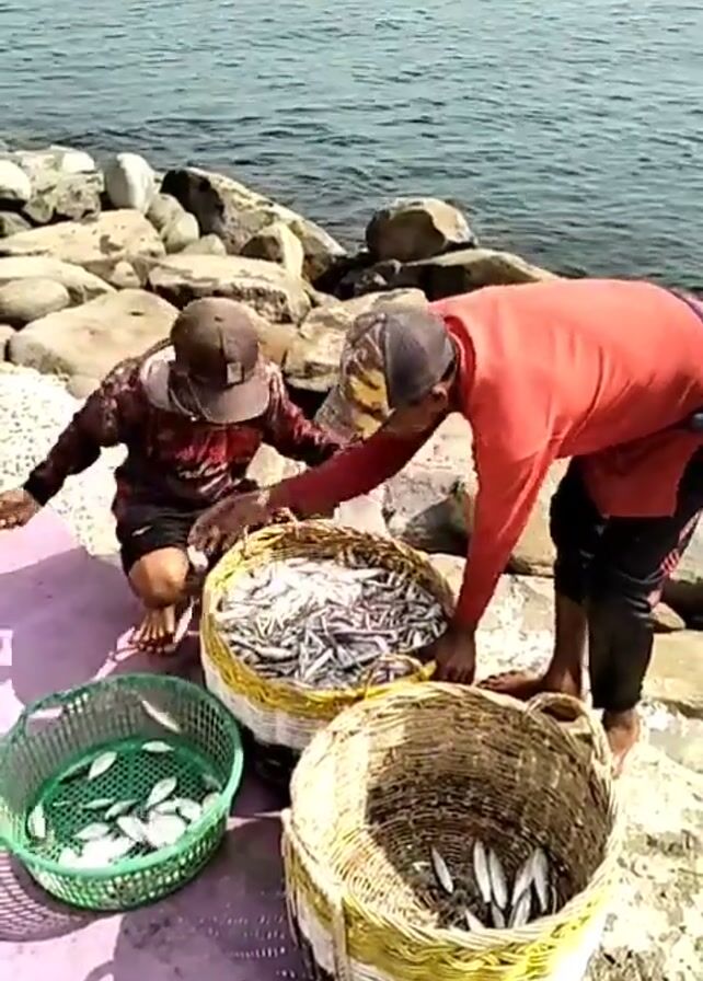 Two men are sorting small silvery fish into woven baskets on a shore. They are both wearing long-sleeved shirts and caps. One has on a red shirt and black pants, while the other has on a maroon and black patterned shirt. They are standing next to a rocky sea wall. A purple tarp is beneath the baskets of fish. There are three full baskets, and one partially filled smaller green basket. The water in the ocean is turquoise.
