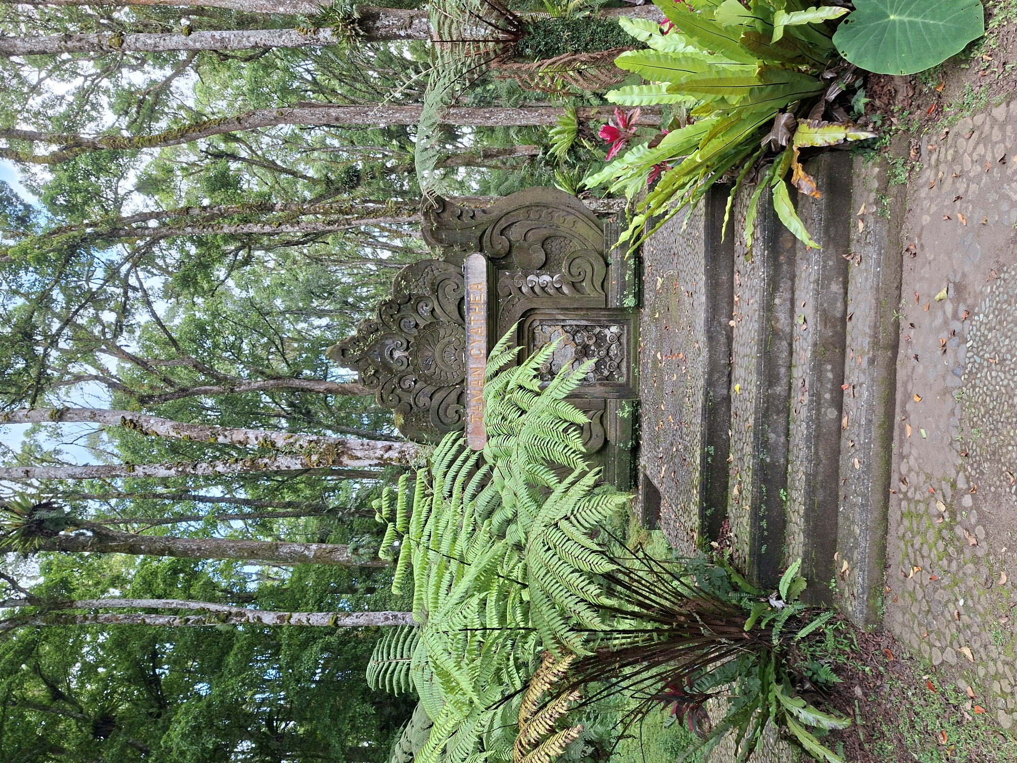 A stone gate is positioned at the base of a set of stairs in a forested area of Baturiti, Indonesia