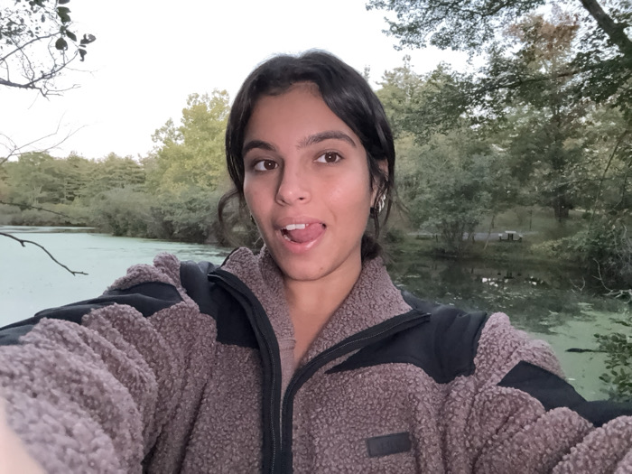 A young adult female is centrally positioned in a selfie-style photograph taken outdoors. She has dark hair and eyes, with a playful expression, her tongue slightly extended and eyes directed to the upper right. She wears a brown, textured fleece jacket featuring dark grey or black panels on the shoulders and upper sleeves. The background consists of a body of water, likely a pond or wetland, almost entirely covered by green aquatic vegetation. Beyond the water, dense trees and foliage are visible, with a white picnic table partially discernible on the far bank. A bare tree branch extends into the frame from the upper left. The environment suggests a natural park or preserve, specifically consistent with areas within **Institute Woods** or **Princeton Battlefield State Park** in **Princeton, New Jersey, United States**.