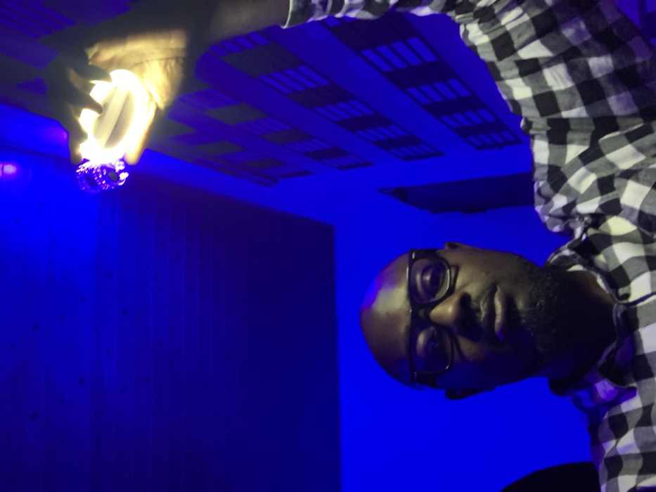 A man wearing glasses and a checkered shirt is illuminated by blue lighting. He is positioned in the lower right of the frame. Above and to the left, a hand holds up a circular light source, which is shining on a decorative object that appears to be a disco ball. The ceiling has a pattern of dark rectangles. The walls are a solid blue color.