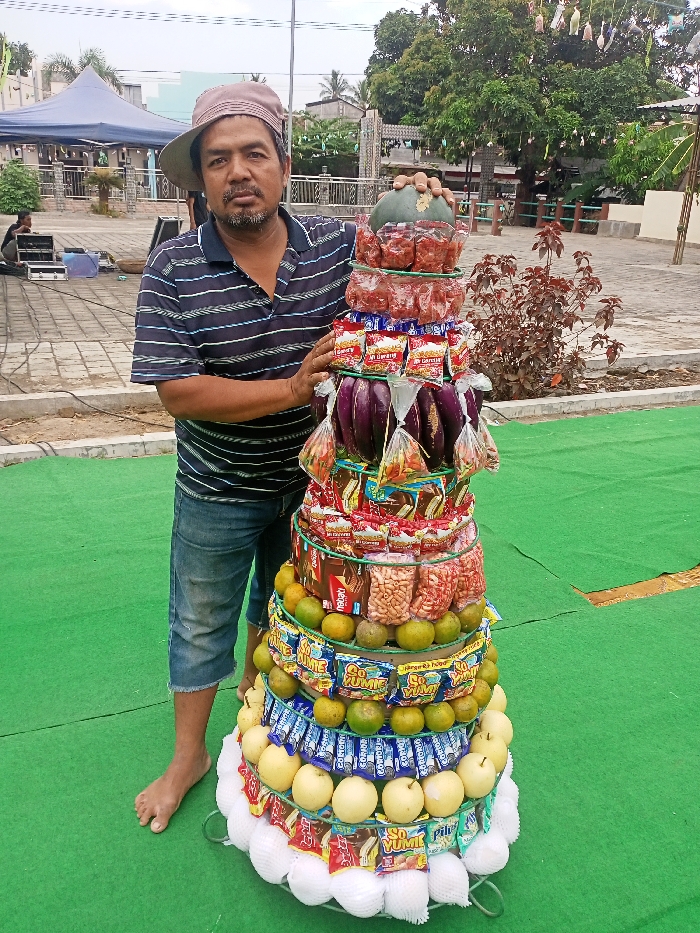 An adult male stands barefoot in Kedung Dowo, Indonesia, next to a large, multi-tiered food display