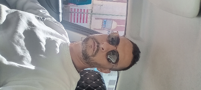 An adult male is seated inside a vehicle, looking directly forward. He possesses short dark hair, a trimmed beard, and wears reflective sunglasses with light brown, possibly tortoiseshell, frames. His attire consists of a light-colored, long-sleeved crew-neck sweatshirt with a small dark emblem on the left chest. A thin metallic chain is visible around his neck. Strong sunlight illuminates the subject from the front-right, creating distinct shadows on his clothing. Behind the subject's right shoulder, a black seat cover with a diamond stitch pattern is partially visible. Through the vehicle's side window, an urban street scene in Meknes, Morocco, is visible. The background features a multi-story building exhibiting a facade with vertical dark red and light-colored stripes on its upper levels, and horizontal red and white stripes on a lower section, possibly shutters. A portion of a light blue vehicle is visible on the far left of the frame. The scene is illuminated by natural daylight.