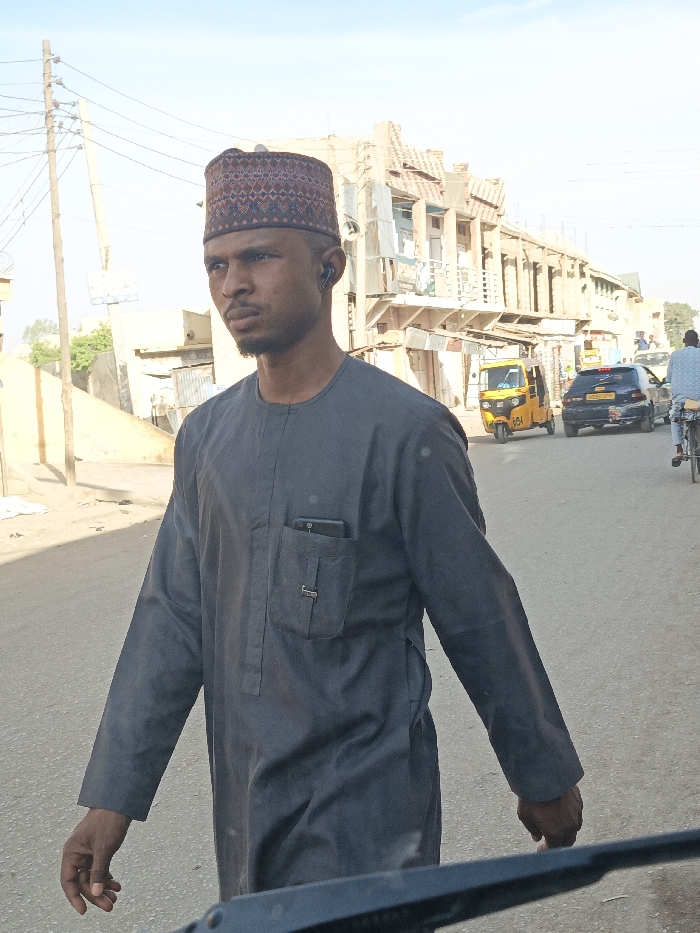 A man in a grey traditional garment and patterned cap walks along a road
