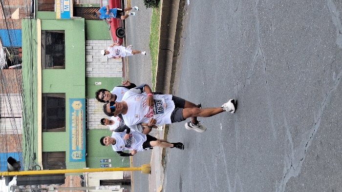 The image depicts an urban street scene during a daytime running event in Miraflores, Peru