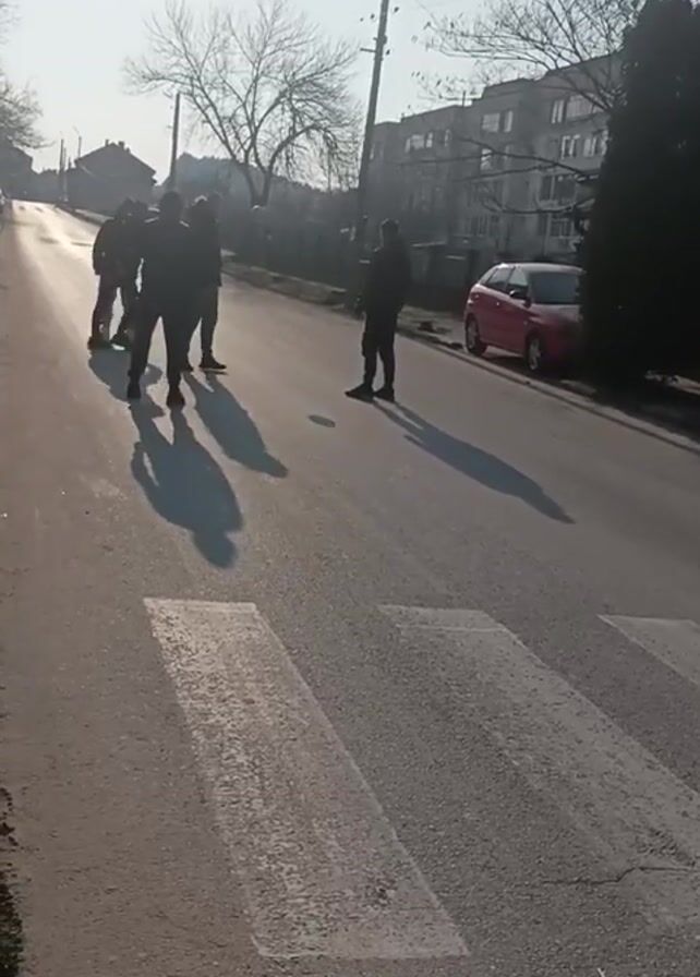group of people walking along a street on a sunny day. There are five individuals in the group, all silhouetted against the bright sunlight. They are wearing dark clothing and appear to be walking in a casual manner. One of them kicks a soccer ball into the air before resuming the group's path. The street has a crosswalk with thick white lines. A red car is parked on the right side of the street, near a green tree. In the background, there are buildings and power lines. The overall scene conveys a sense of ordinary, everyday life in a suburban or urban environment.