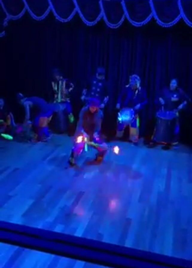 group of performers putting on a show in a small theater lit by blue light. In the center of the stage, a man in a hat and colorful costume juggles flaming torches. He is surrounded by other performers, some of whom are playing drums and others who are seated with illuminated objects. There is an audience watching from a row of seats in front of the stage. The theater has a stage curtain and a decorative rope above the stage. The room is dark except for the blue stage lights and the colorful lights on the performers' objects.