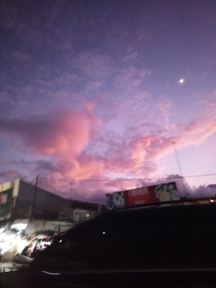 A stunning dusk sky displays layered pink and purple clouds. The moon hangs high in the upper right. Below, a blurred cityscape is visible. A dark vehicle occupies the foreground, reflecting light. A billboard displaying "CardinaL" is perched on a building roof. Other blurred structures are seen to the left, suggesting an urban environment. Power lines cut through the sky above the buildings.