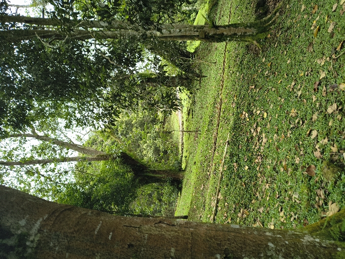 A verdant, grassy slope extends through a forest. Tall trees frame the scene, with dense foliage creating a partial canopy overhead. Fallen leaves dot the ground, intermingling with the green grass. A wooden post stands in the background, marking a path or boundary. The perspective is slightly upward, emphasizing the height of the trees and the gentle incline of the land. Moss grows on some of the tree trunks.