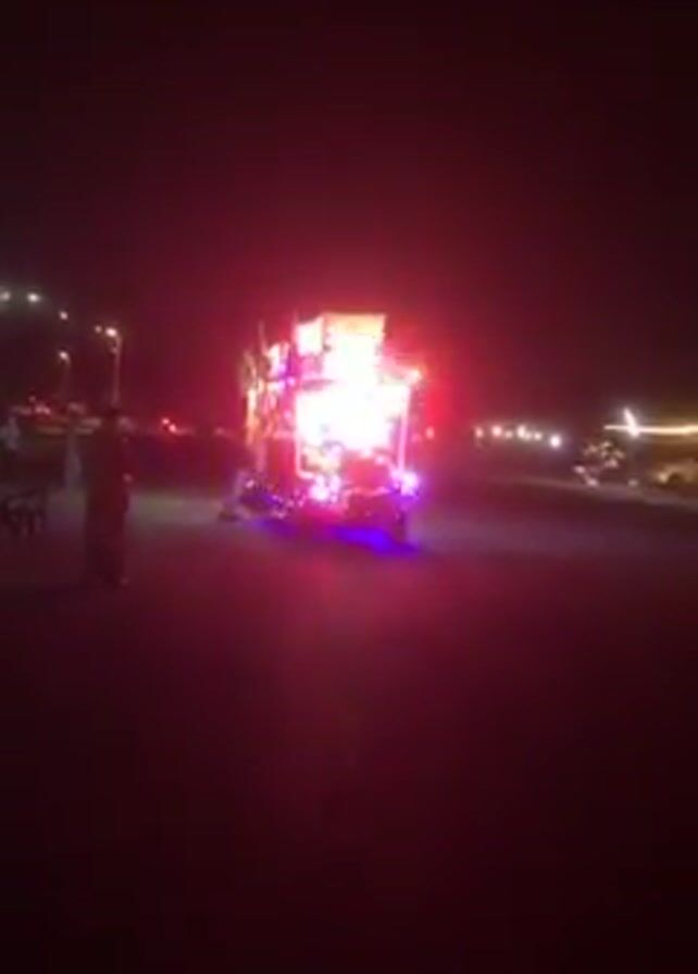 brightly lit vehicle, likely a food truck or mobile stall, at night. The vehicle is decorated with colorful lights and seems to be parked on a street with other parked vehicles and streetlights visible in the background. A person is standing near the vehicle, but it is difficult to discern their features in the dark. The overall atmosphere is dark with contrasting bright lights coming from the vehicle.