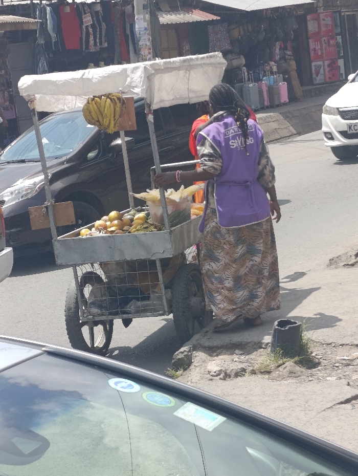 The image displays a daylight street scene in Matungulu west ward, Kenya. A female street vendor, viewed from behind, stands adjacent to a three-wheeled metal pushcart. She wears a long, patterned skirt, a light-colored long-sleeved top, and a purple vest or apron with "DARLING STYLIST" printed in white. Her dark hair is styled in braids or dreadlocks. The vendor's cart features a white fabric canopy. A bunch of yellow bananas hangs from the front of the canopy frame. The cart's main display area holds various fruits, including yellow mangoes or oranges, some green produce, and multiple clear plastic bags containing husked corn. Below the main compartment, a metal cage structure contains dark, indistinct objects. The vendor is positioned on an elevated, uneven concrete or dirt pavement area bordering an asphalt road. A broken concrete pipe segment lies on the pavement near her feet. To the left of the cart, a dark-colored SUV or hatchback is partially visible on the road. To the right, a white car with a Kenyan license plate (starting with "KC") is also on the road. In the background, behind the vehicles and vendor, are several market stalls or shops. The left background shows hanging clothing items for sale, with some price tags visible (e.g., "800"). The right background features stalls displaying luggage, including pink, blue, and silver suitcases, among other goods. The immediate foreground shows the upper part of a car's windshield and roof, with several stickers affixed to the windshield. Shadows indicate a bright, sunny environment.