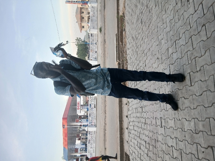 A man in a blue shirt and jeans stands on a paved sidewalk holding a plastic bottle. He wears glasses atop his head and a backpack. Behind him is a gas station with a prominent "DIESEL" sign. The sidewalk is made of gray interlocking paving stones. In the distance are buildings and clear skies. A figure in a red shirt is walking in the foreground. The picture is sideways.