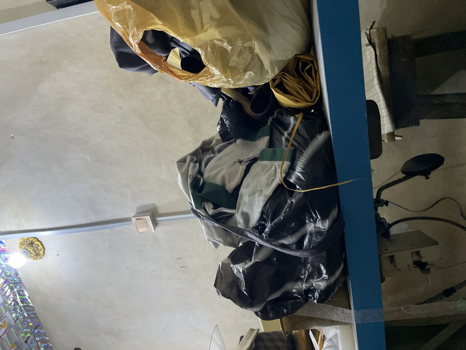 A cluttered shelf with various items is seen from a tilted angle. A yellow plastic bag overflows with contents on top. Below, a black trash bag bulges with what appears to be clothing, including white gloves with green trim. Further down, another black bag adds to the disarray. A blue frame obscures part of the scene, while a microphone stand and other equipment are visible to the right. The background features a textured wall and a partial view of a ceiling with a light fixture.