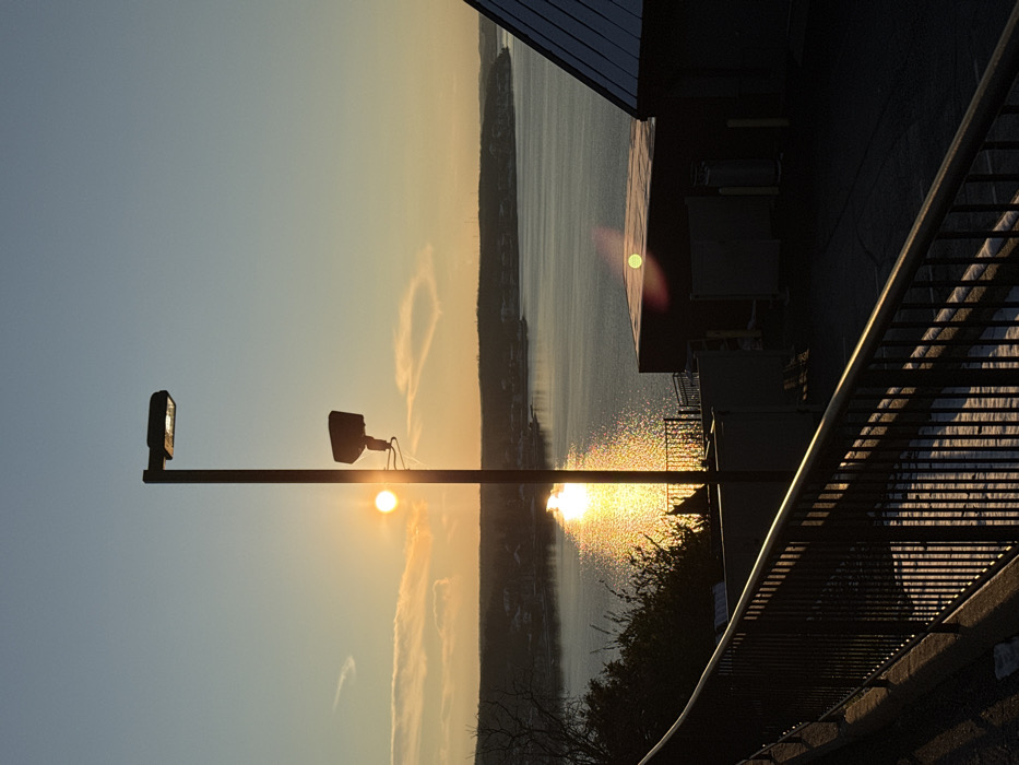 A landscape view shows a body of water, possibly a river or lake, reflecting the sun's glare. Silhouetted trees and land define the opposite shore. A light post with two lamps stands in the foreground, one catching the sun's light. Part of a building with a railing occupies the right side of the frame, casting shadows. A wispy cloud formation resembling a heart hangs in the sky above the water.