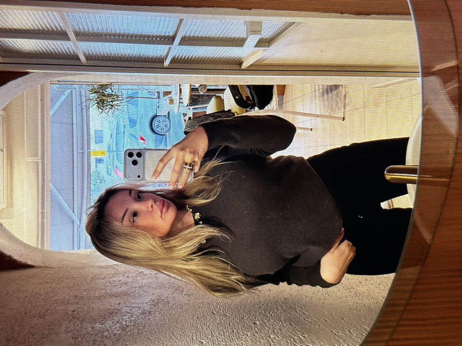 A woman takes a selfie in a mirror. Her blonde hair is shoulder-length. She wears a dark sweater and a floral necklace. The phone case appears clear, revealing the phone. Reflected in the mirror is a street scene with a building and a car. An office-like space with a white ceiling is visible above the woman. The mirror is framed by beige-colored walls. A dark coat hangs near a table in the reflection.