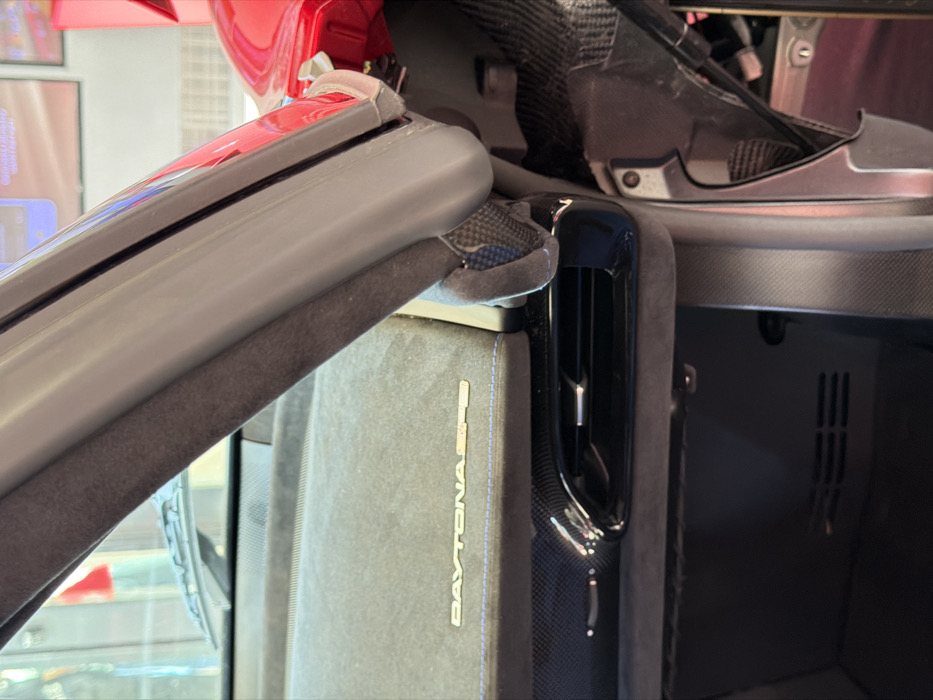The image depicts the passenger side interior of a vehicle, captured in Herzliya, Israel. The dark grey dashboard is upholstered in an Alcantara-like material, featuring a metallic "DAYTONA SP3" emblem with subtle blue stitching underneath. Below the main dashboard surface, a black panel with a visible air vent exhibits a carbon fiber texture. The glove compartment is open or its door is removed, revealing a dark grey interior with a vented grille at the bottom. To the immediate right, interior trim components, including grey plastic and exposed mechanical elements consistent with a door hinge or frame, are visible, along with a portion of a red exterior car body. A dark grey fabric-covered A-pillar is present on the upper left. The scene is brightly illuminated, indicating an indoor setting such as a showroom or garage. No individuals are present.