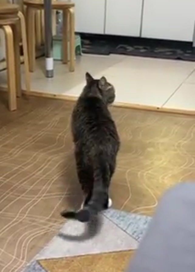 The camera films a cat from behind on a patterned, wood-laminate floor