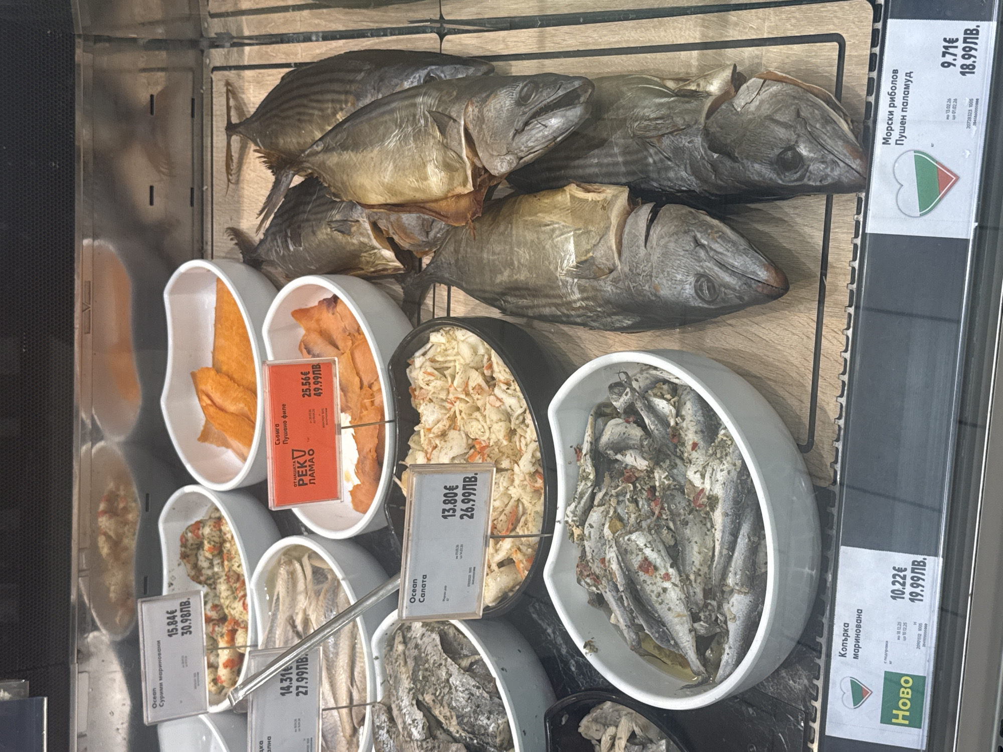 refrigerated display case in a store, likely a supermarket, containing various types of prepared fish products. The top row features whole smoked mackerel. Below these are white bowls containing pieces of smoked salmon, and salads. These salads appear to be crab salad, herring, and anchovies. Price tags are visible for each item with prices in both Euros (€) and Bulgarian Leva (ЛВ). The price tags have symbols that resemble Bulgarian flags. The scene appears to be in a grocery store or supermarket, based on the display and the presence of price tags. Due to text on the prices tags (in Bulgarian) the scene is presumed to be in Bulgaria, specifically in the city of Botevgrad.