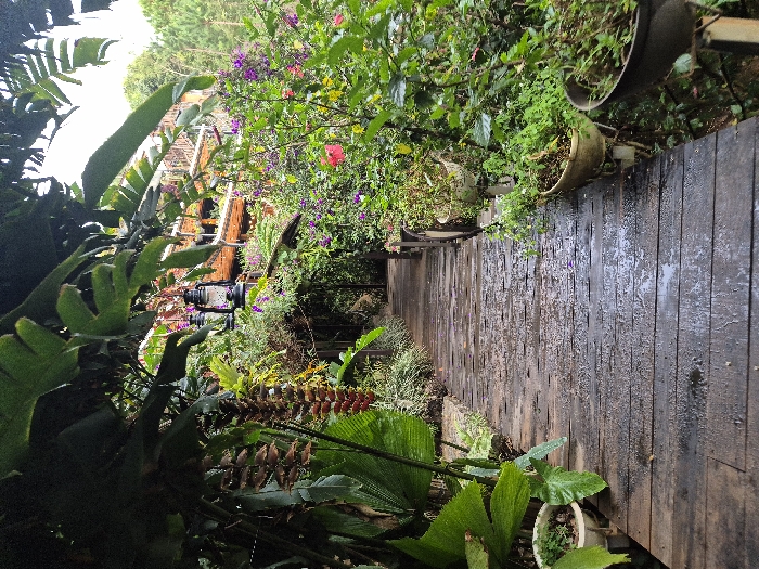The image depicts a verdant, semi-enclosed outdoor pathway in Thôn 5, Vietnam. A dark wooden boardwalk, visibly wet with moisture, extends from the foreground toward the background, subtly curving leftward. On the left, dense, large-leafed tropical foliage and smaller green plants overhang the path. A prominent, elongated, red-brown hanging inflorescence, possibly a Heliconia, descends from the overhead canopy. Several potted plants, some in white containers, are situated at ground level alongside the left edge of the path. On the right, a lush garden of varied green plants and colorful flowers, including purple and red blooms resembling hibiscus, lines the boardwalk. Multiple potted plants in different containers, some appearing to be suspended or elevated, are arranged along this side. Two dark, vintage-style lanterns are visible, hanging amidst the foliage above the right side of the path. In the background, partially obscured by vegetation, a multi-story building with wooden balconies or terraces is visible. Beyond this structure, conifer trees are present against a bright, overcast sky. No individuals are present, and no active interactions or actions are occurring.