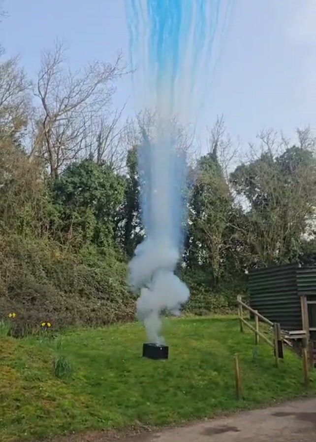 gender reveal being done in a yard. The yard has grass, trees, and a small wooden fence. A black box is sitting in the middle of the grass. When the gender reveal is activated, a puff of blue smoke erupts from the box into the sky. A voice is heard saying "Brady, you shit yourself then?".