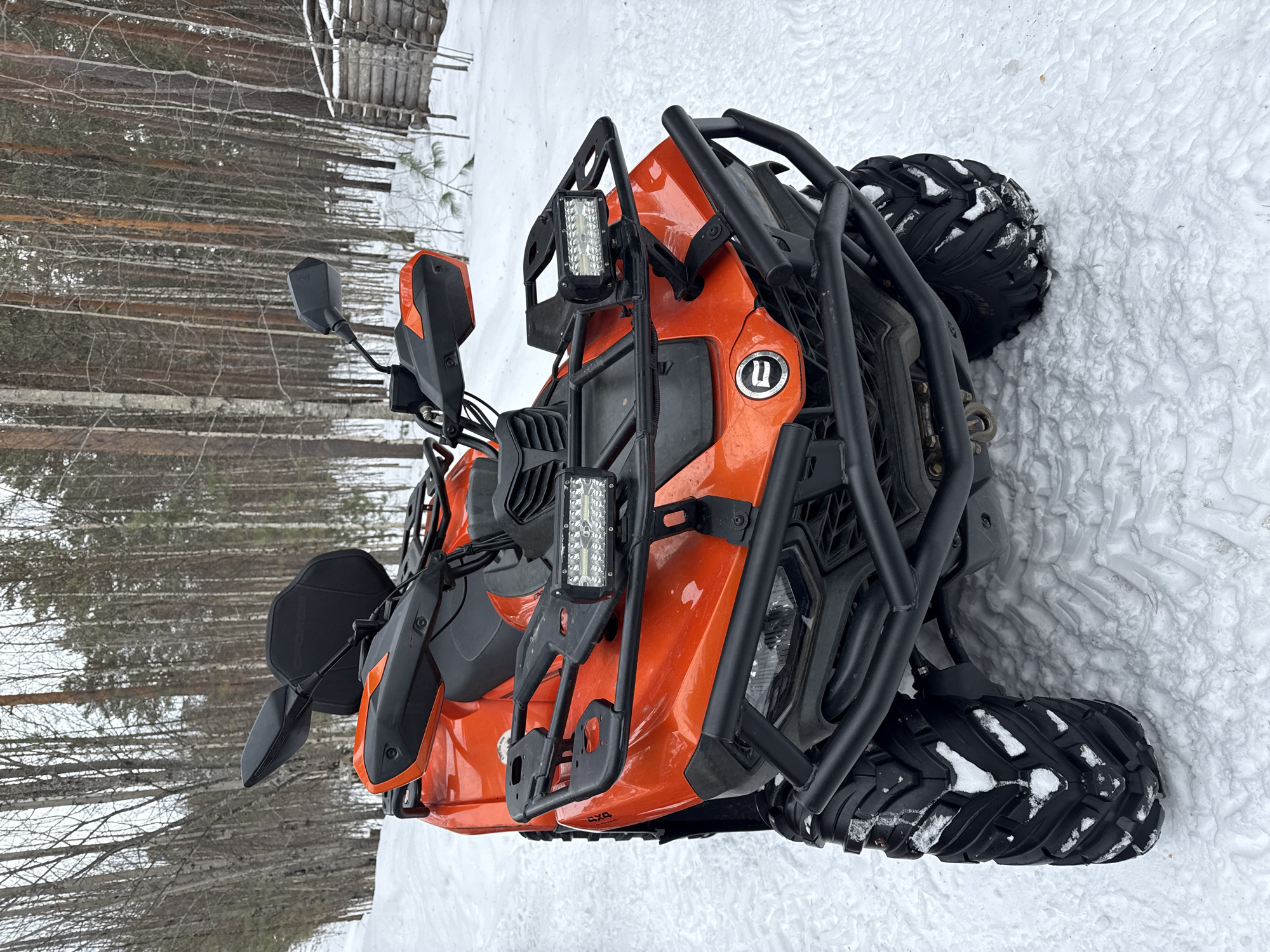 An orange four-wheeled all-terrain vehicle (ATV) is positioned on a snow-covered surface. The vehicle features black safety bars, side mirrors, and LED auxiliary lights attached to its front. The ATV's tires are deeply grooved, indicating off-road capabilities. The backdrop consists of a dense forest with bare trees and snow-covered ground. Above the forest is a wooden structure. There is no indication of it being located in Izluchinsk, Russia.