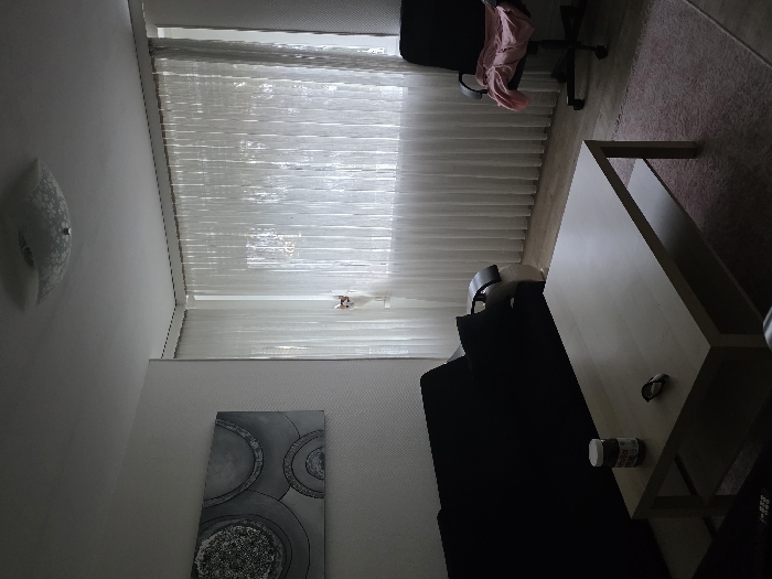 A room features a large window covered by sheer white blinds. A black office chair with a pink garment rests near the window. A beige coffee table sits on a pink rug. A black couch is positioned near the table. On the table, there's a can and a small object. A painting with gray circles adorns the wall. A ceiling light is visible in the top left corner.
