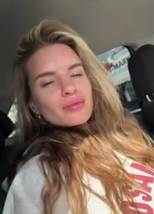 A woman with long, wavy blonde hair, blue eyes, and full lips is sitting in the driver's seat of a car. She is wearing a light-colored sweatshirt with red lettering on it. The interior of the car is visible, including the headrest of the driver's seat, the ceiling, and the sun visor. Outside the car window, a building with a red sign that says "MART" is visible. The woman looks at the camera and briefly turns her head to the side.