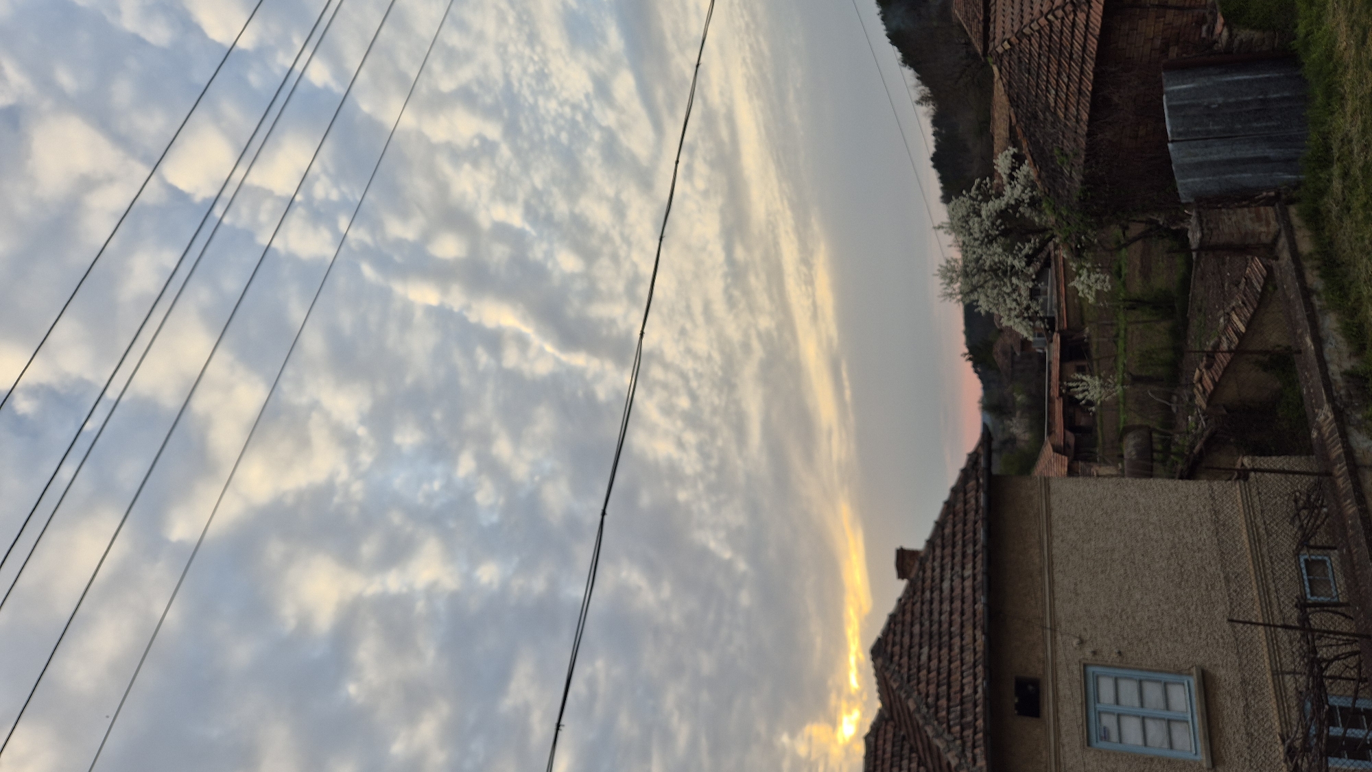 view in Mihaltsi, Bulgaria. Power lines are visible against a sky filled with textured clouds, reflecting the warm light of a setting sun. To the right, a cluster of traditional houses with red-tiled roofs and textured walls are seen. One house displays a blue-framed window. A flowering tree is present. In the background, a tree-covered hill is seen. The houses are interspersed with green vegetation.