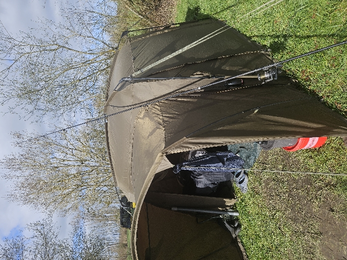 This image depicts an outdoor scene located in the city of Gavisse, France. The primary subject is a dark olive-green, dome-shaped fishing bivvy (tent) erected on a grassy area. The ground immediately surrounding the bivvy's entrance exhibits compacted earth and mud, indicating foot traffic. A black fishing rod, fitted with a reel, is propped against the right side of the bivvy, extending vertically out of frame. Adjacent to the bivvy's right entrance, a red plastic bucket, with "KORUM" partially visible in white lettering, rests on the ground. The bivvy's left entrance flap is partially open, revealing various items inside, including dark-colored bags, what appears to be a fishing net or fabric gear, and a pair of footwear. In the background, deciduous trees with bare branches are visible against a partly cloudy blue sky. A dark-colored vehicle is partially discernible behind the trees in the upper left portion of the image. No individuals are present in the scene.