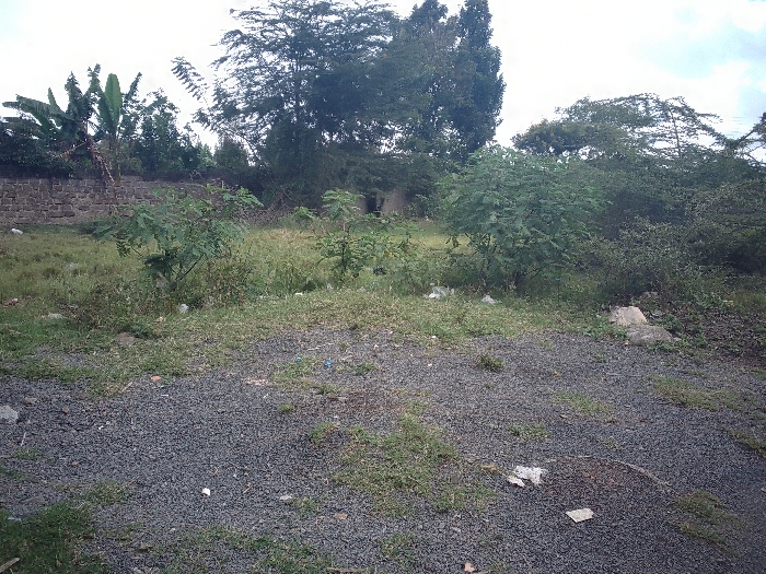 The scene depicts an undeveloped, overgrown plot of land in Juja ward, Kenya, under an overcast sky