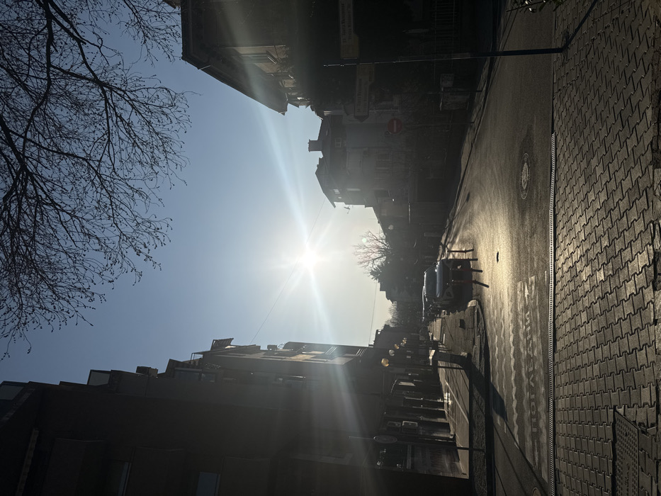 The image presents a static, sunlit urban street scene in Blagoevgrad, Bulgaria, taken from a low vantage point on a paved sidewalk. The perspective looks down an asphalt street, oriented towards the low sun positioned centrally, generating significant lens flare and strong backlighting across the scene. On the left, a multi-story building with visible balconies stands in deep silhouette. Along the sidewalk adjacent to this building, a series of streetlights with spherical luminaires are present. Several passenger vehicles are parked parallel to the curb on the left side of the street, partially obstructed by red and white striped bollards. The asphalt roadway features a marked pedestrian crossing with white stripes and the Cyrillic word "ПОГЛЕДНИ" (LOOK) painted on the surface. A circular manhole cover is visible mid-road. On the right side, an older, multi-story building, also heavily silhouetted, frames the street. A red circular "No Entry" sign is mounted on a pole, alongside two yellow rectangular street signs. These signs identify the location as the intersection of "ул. Братя Георгиеви" (ul. Bratya Georgievi), "ул. "Никола Вапцаров"" (ul. Nikola Vaptsarov), and "ул. "Васил Мечкуев"" (ul. Vasil Mechkuev). The upper right quadrant features bare, deciduous tree branches silhouetted against a clear, light blue sky. No individuals are present. The strong sunlight creates distinct shadows and bright reflections on the road surface.