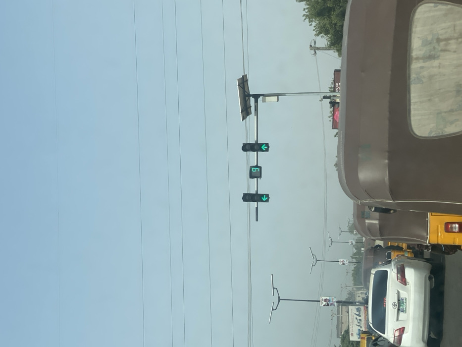 The image depicts a daytime urban street scene in Hotoro South, Nigeria, viewed from the perspective of a vehicle stopped in traffic. The sky is a light, hazy blue, with several thin utility lines stretching horizontally across the upper frame. Centrally positioned overhead is a traffic light system mounted on a horizontal bar. This system includes a green left-turn arrow, a digital countdown display showing the number '9' in green, and a green straight-ahead arrow. The traffic light assembly is supported by a tall pole on the right side, which also features a rectangular solar panel mounted at its top. In the immediate foreground, partially visible on the right, is the brown roof and a portion of the window of an auto-rickshaw. Behind this, in multiple lanes, are numerous other auto-rickshaws, predominantly yellow and brown, suggesting dense traffic. To the left of these auto-rickshaws, a white Toyota Camry sedan, bearing the license plate "ABC-739RR", is stationary. Further down the road, additional vehicles are discernible. Along the left side of the street, several modern, T-shaped streetlights with dual fixtures are visible, receding into the distance. Utility poles with overhead wires are also present on the far right. The background features distant commercial buildings and signs, including one with partially visible text "SAUDAU", and sparse green foliage, all appearing somewhat muted due to atmospheric haze. No individuals are clearly visible or identifiable within the frame.