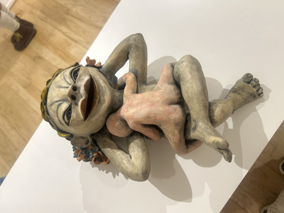 A peculiar ceramic sculpture lies on a white surface. It depicts a figure with a grotesque, grinning face adorned with yellow and blue floral accents. The figure's body is oddly proportioned, with arms raised behind the head and legs crossed. A pinkish, fleshy form emerges from the figure's torso, further distorting the anatomy. The piece has a weathered, aged appearance, with muted earth tones dominating the color palette. Part of a person's shoes are seen off to the side.