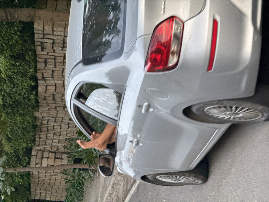 A silver four-door sedan, consistent with a Mitsubishi Mirage G4, is observed from its rear three-quarter passenger side, traveling on a paved road in Vĩnh Lương, Vietnam. From the open front passenger window, two bare human feet are extended outward, resting with the soles pointed upwards on the window frame. The vehicle's wheels exhibit motion blur, indicating forward movement. In the background, a textured stone wall constructed from rectangular blocks runs horizontally, topped by dense green foliage. A slender tree trunk is partially visible to the left of the stone wall. The scene is illuminated by natural light.