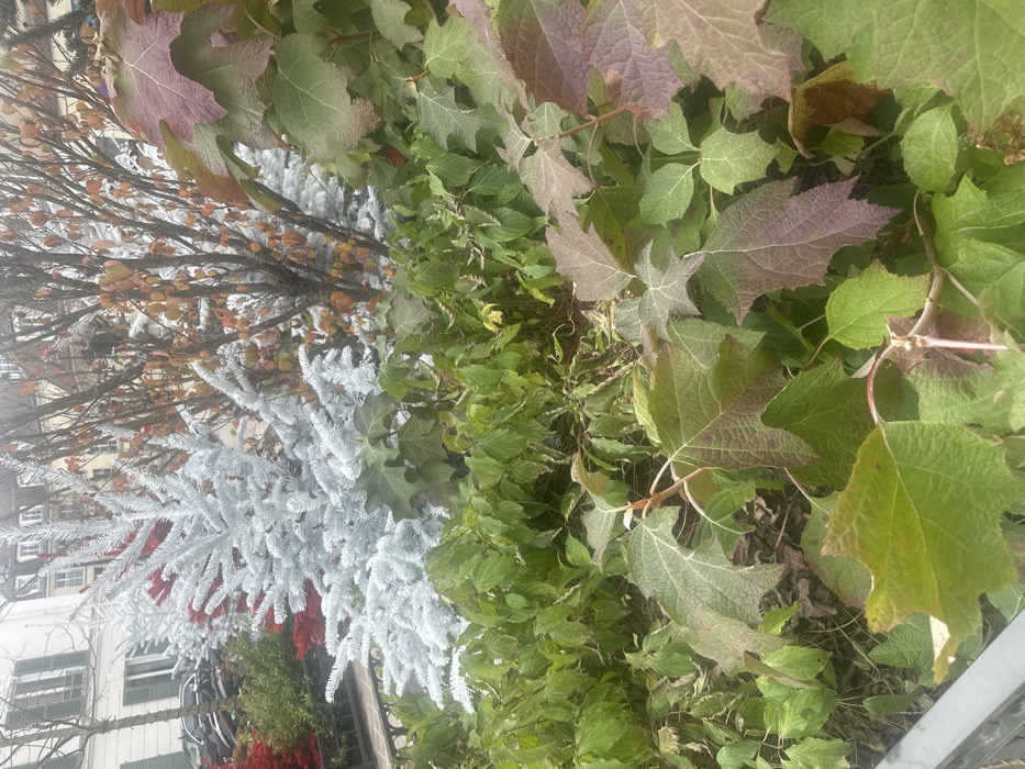 The image displays an outdoor scene in Saint-Germain-en-Laye, France, during what appears to be late autumn or early winter. The foreground is dominated by dense foliage, primarily large, lobed leaves of a plant resembling Oakleaf Hydrangea, exhibiting a range of green and reddish-purple hues. Partially visible at the bottom left is a dark, possibly metallic, railing. The midground features multiple artificial Christmas trees; a prominent, light-frosted white artificial tree stands centrally, with a smaller, red artificial tree positioned behind it. Interspersed with these are several deciduous trees with mostly bare branches, some retaining sparse, dried orange-brown leaves. In the background to the left, a light-colored building with multiple windows and green shutters is partially visible, in front of which a dark-colored vehicle is parked. The sky is overcast, indicating diffuse lighting. No individuals or dynamic actions are depicted.