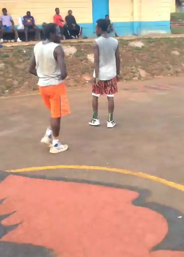 group of people on an outdoor basketball court. A yellow building with a blue trim and a blue door is in the background. Several people are sitting on a bench in front of the building, watching the basketball players. Two men in basketball attire are standing on the court, one wearing orange shorts and the other wearing patterned shorts. The court has yellow lines and a painted section. The overall environment seems casual and recreational.