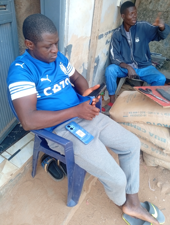 Two adult males are depicted outdoors in Jos, Nigeria. In the foreground, a dark-complexioned male, wearing a blue Olympique Marseille soccer jersey and light grey sweatpants, sits on a blue plastic stool. He is looking down intently at a black smartphone held in his hands. A light blue smartphone with a clear case rests on his left thigh. Dark-colored flip-flops are visible under his stool. In the background, to the right, another dark-complexioned male is seated on a lower surface behind a stack of BUA cement bags. He wears a dark blue track jacket, dark blue track pants, and red flip-flops. His right hand is raised in a gesture, and his mouth is slightly open, suggesting he is speaking. On the cement bags next to him, a pair of scissors and other items are present. The ground consists of reddish-brown earth. A weathered, light-colored wall with peeling paint is visible in the background.