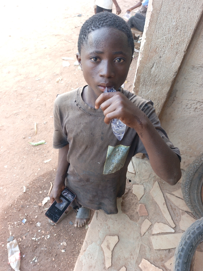 This image, captured in Akwanga, Nigeria, shows a young, dark-skinned male child centered in the foreground, looking directly at the camera. He wears a soiled, short-sleeved brown t-shirt with a discolored front pocket and grey sandals. His left hand holds a black smartphone displaying a screen image. His right hand is raised, holding a clear plastic sachet of water to his mouth, from which he is drinking. The ground beneath him is reddish-brown dirt, littered with small debris, including plastic fragments and organic matter. To his right, a rough, light-colored concrete or mud structure rises vertically, with an area of broken tile fragments embedded in concrete on the ground beside it. Portions of two tires are visible along the far right edge of the frame. In the blurred background, several other individuals are vaguely discernible, one wearing a white shirt, indicating a populated outdoor setting.