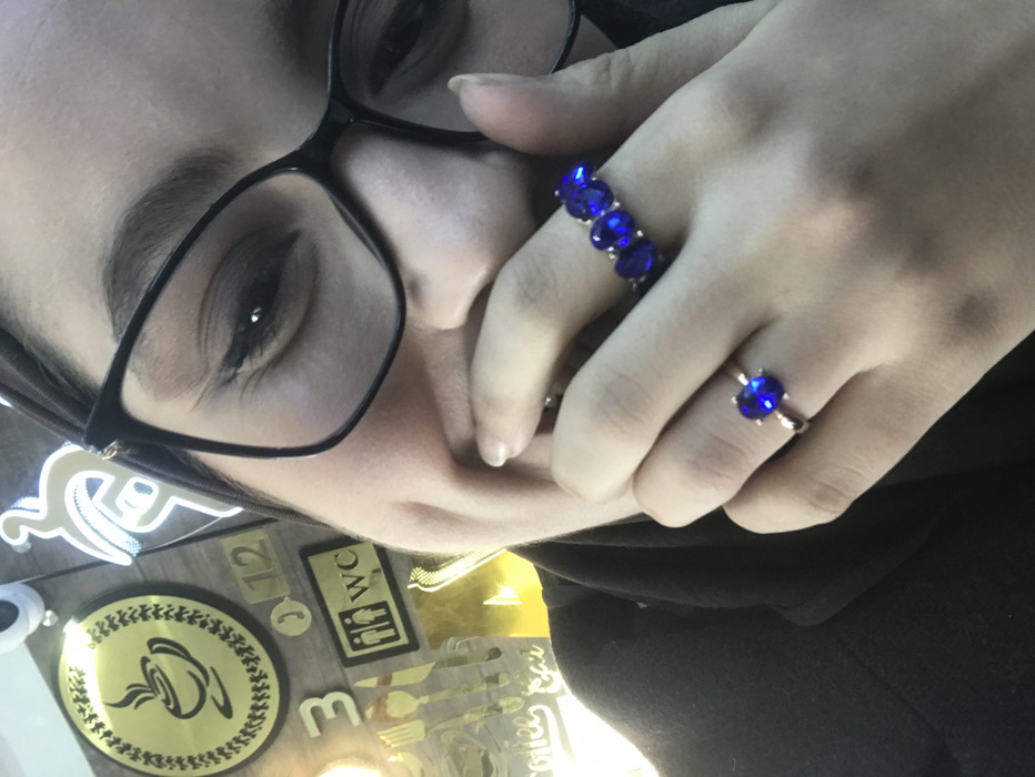 The image displays a close-up, chest-up view of an individual, presumed female, in an interior location within Meknes, Morocco. The subject is wearing black-framed eyeglasses, through which the right eye, featuring visible eyeliner and eyelashes, is discernible. The left eye is partially visible. A dark head covering is present. The individual's left hand, with unpolished fingernails, is raised to cover the lower half of the face, suggesting a smile or laugh, indicated by crinkling around the eye. On the left ring finger, a silver-toned ring with a single oval blue gemstone is worn. On the left middle finger, a silver-toned ring with five consecutive oval blue gemstones is present. The background, likely a wall, is adorned with various signs. These include a circular gold-colored sign with a black coffee cup motif, the gold-colored numbers "3" and "12," a black rectangular sign with gold male and female figures and the letters "WC," and gold-colored outlines of cutlery (fork and knife). A small white security camera is mounted in the upper left background, near a decorative white illuminated sign.