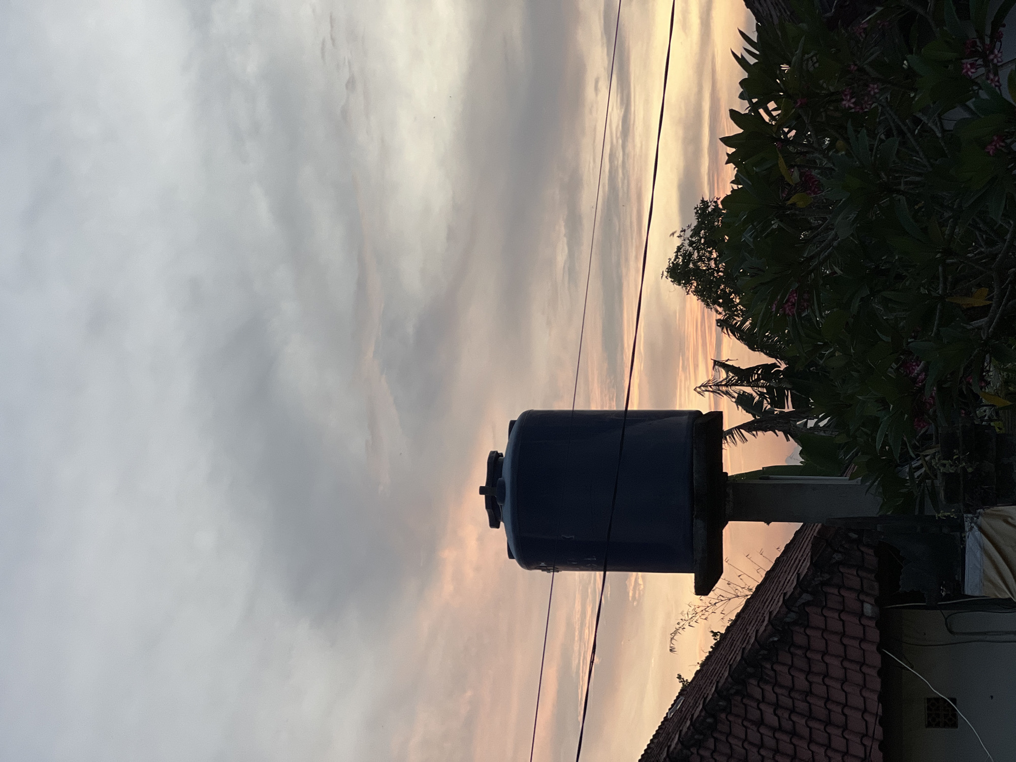This image depicts an outdoor scene in Celuk, Indonesia, at either sunrise or sunset, indicated by the sky's coloration. The sky occupies approximately two-thirds of the frame, featuring extensive cloud cover with soft pink and orange hues at the horizon transitioning to cooler gray tones overhead. In the mid-ground, a large, dark blue cylindrical water tank is centrally positioned, elevated on a light gray concrete support pillar. Multiple dark utility lines, likely electrical or communication wires, traverse the mid-ground horizontally, two of which pass in front of the water tank. To the left, a portion of a building with a reddish-brown terracotta tiled roof is visible. The lower-left corner reveals a cream-colored wall section of this structure, featuring a small square vent opening. Dense tropical foliage, characterized by dark green leaves and scattered pink blossoms, occupies the lower right and extends towards the center, partially obscuring the base of the water tank's support and other background elements. No people or overt activities are visible.