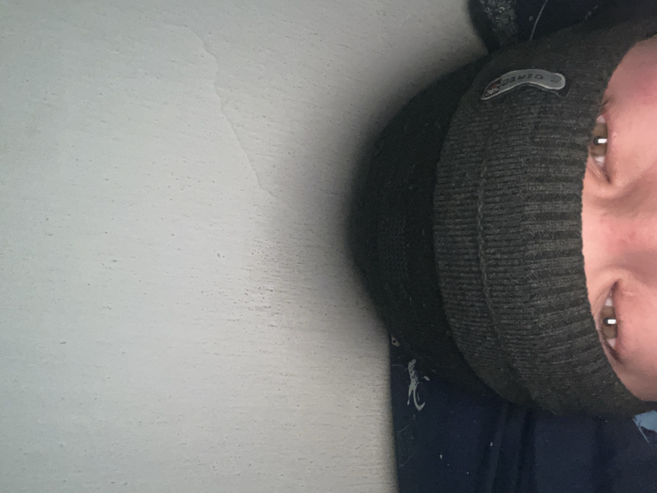 A close-up image shows a person wearing a dark green knitted beanie. The beanie has a small, metallic logo. The person's eyes are visible and appear to be brown. Part of their nose and mouth can be seen. The background is a plain white wall. The lower part of the image includes a blue shirt and a few white markings. The image appears to be rotated.
