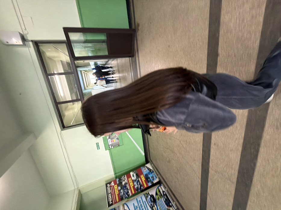 The image captures an indoor hallway or corridor within a building in Cherven Bryag, Bulgaria. In the foreground, a female with long, straight, dark brown hair is observed from a rear-right perspective, in motion, walking towards the right side of the frame. She is attired in a dark grey velour tracksuit and a black vest, holding a small orange-colored object in her right hand. The floor is light-colored tile or concrete, marked by two dark horizontal stripes. The walls are painted in a two-tone scheme: light mint green on the upper section and a darker green below, delineated by a white horizontal stripe. On the left wall, a large vertical banner is displayed, featuring the text "УЧЕБЕН ЦЕНТЪР" (Training Center in Bulgarian) and various vehicle images, indicative of a driving school or similar educational facility. Below the banner, a green utility box with a white horizontal stripe and a small white sign bearing a green left-pointing arrow are present. Exposed electrical wiring runs along the upper left wall. In the midground, a wide doorway with dark brown framing and glass panels opens into a longer, receding corridor. Above this doorway, a rectangular window-like opening, also framed in dark brown, provides a view into an upper section or stairwell. Within the distant corridor, several indistinct figures, consistent with individuals walking, are visible moving away from the viewer. A white rectangular unit, possibly an air freshener or electrical device, is mounted high on the right wall adjacent to the doorway.